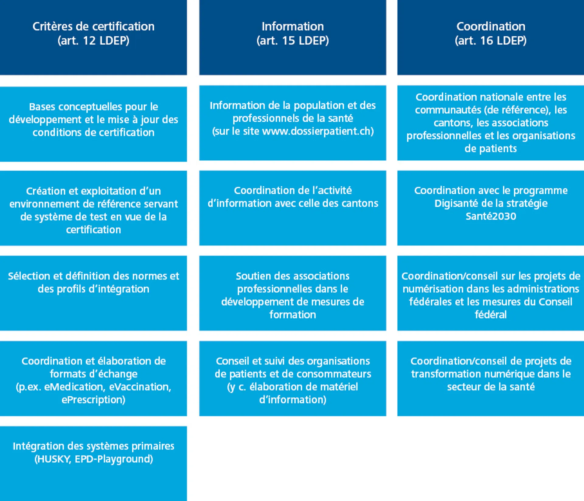 Une mise en réseau numérique nationale du secteur de la santé participe à résoudre le problème. Aussi la Confédération et les cantons ont conclu en 2007 une convention-cadre afin de créer un organe de compétence et de coordination commun, eHealth Suisse, qui a coordonné la mise en œuvre des deux stratégies Cybersanté Suisse entre 2007 et 2024. Depuis 2017, eHealth Suisse est également compétent pour les tâches d’application formelles de la loi fédérale sur le dossier électronique du patient (LDEP). Il coordonne la mise en œuvre du projet national du DEP en collaboration avec l’OFSP, la Conférence des directrices et directeurs cantonaux de la santé (CDS), les communautés DEP et d’autres partenaires actifs dans les secteurs de la santé et de la cybersanté.